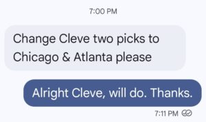 Week 17 Announcement: Pick Change (The Trilogy) A pick change came in moments ago. This one comes courtesy of Cleve: And here are those changes Week 17 Pick Change III [15.15 KB]