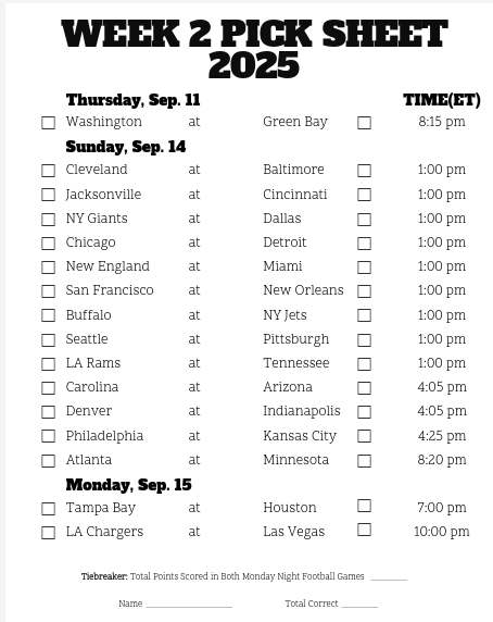 Sheets are due on Thursdays by 5pm as the League’s week begins with the Thursday Night game.  The Winner is announced after the Monday Night game and most importantly, payout is Wednesday morning.