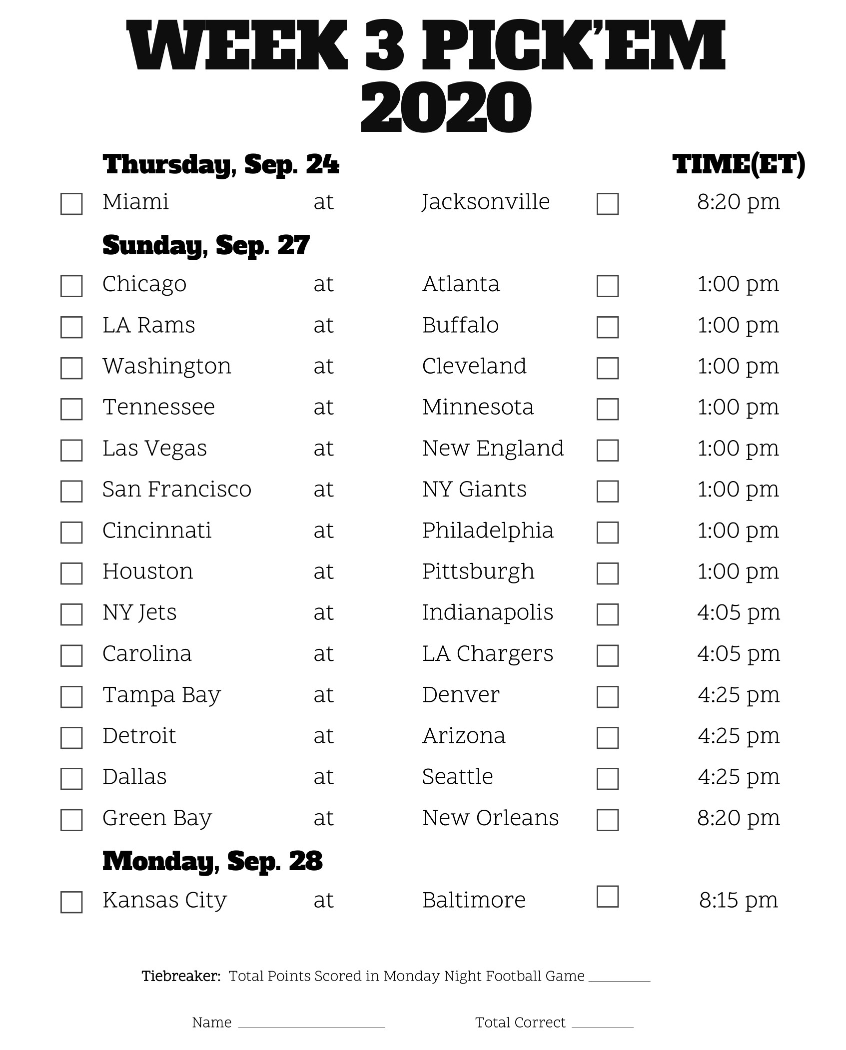 All you gotta do is fill out the sheet. You can either download it, print it out, or look at it while you make your selections. Simply pick the Winning team in each of this week’s games.