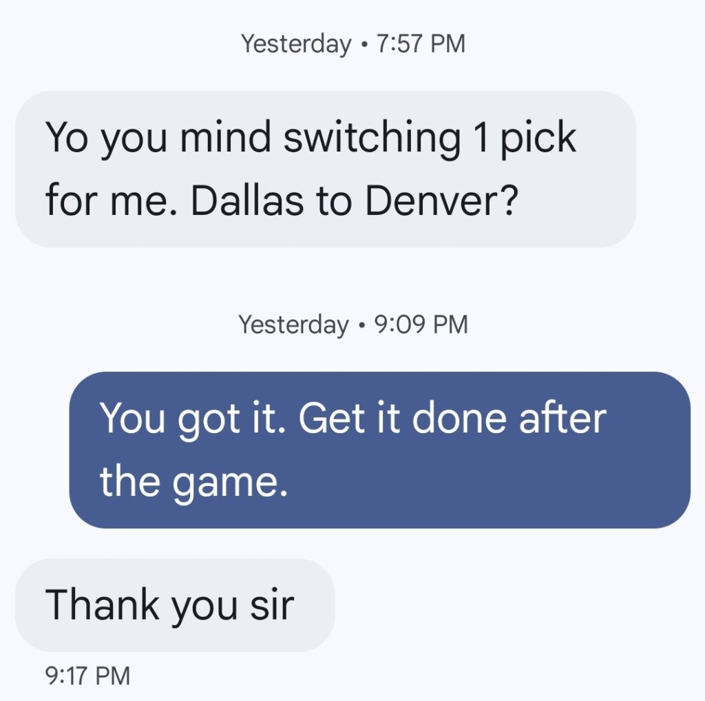 1. Last night we had a pick change. Christian D opted to change his pick in the Dal/Den game. See below: