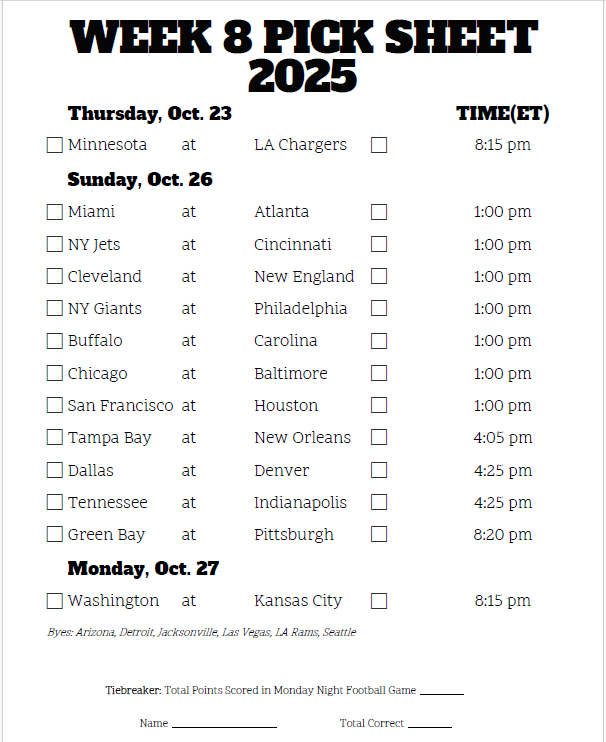 All you gotta do is fill out the sheet. You can either download it, print it out, or look at it while you make your selections. Simply pick the Winning team in each of this week’s games.